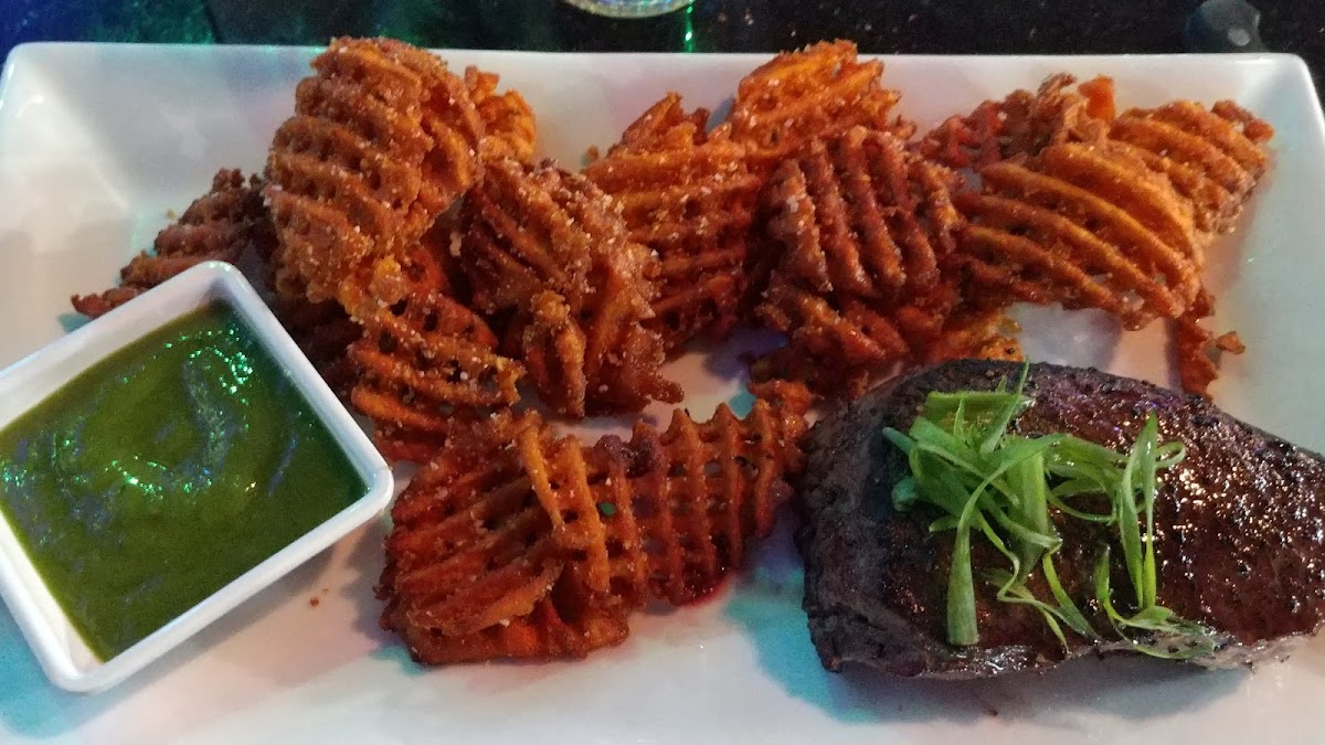 Steak with Sweet Potato Waffle Friesand a Chimichuri Pesto